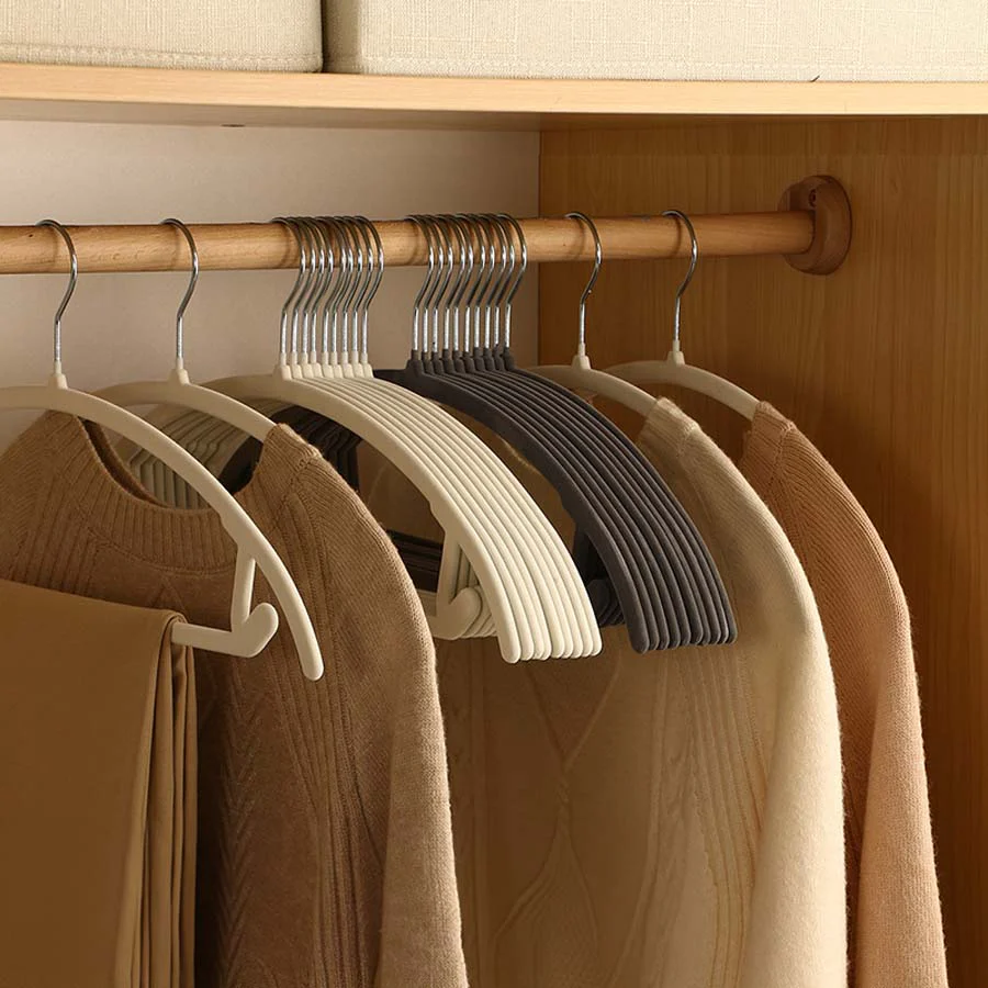 Curved with a non-slip surface, these hangers gently cradle your garments, while the integrated pants holder keeps trousers neatly in place. The sleek metal hook and sturdy construction provide a refined, functional solution for organizing your closet with ease.