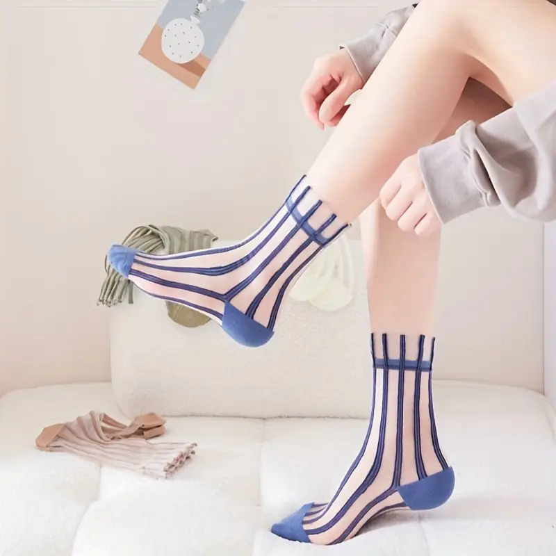 Crafted from sheer mesh and breathable fabric, these socks offer a delicate feel that wraps like a nostalgic hug with every step. Intricate ribbed lines, lightweight mesh, and soft muted tones come together to create a distinctive vintage look.